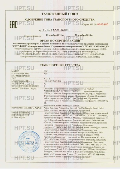 | Предприятие-изготовитель | Anhui Jianghuai Automobile Co..Ltd, No. 176 Dongliu Road, Hefei, Anhui province. Китай |