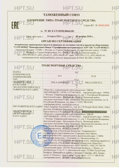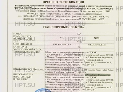 | Заявитель | Общество с ограниченной ответственностью "ДЖАК АВТОМОБИЛЬ". 109004, г. Москва, Товарищеский переулок, 31, стр. 5, Российская Федерация. ОГРН: 1127746758391. Тел. :+7 (495) 789-42-84. Факс :+7 (495) 789-42-84. Email russia@jac.com.cn. |