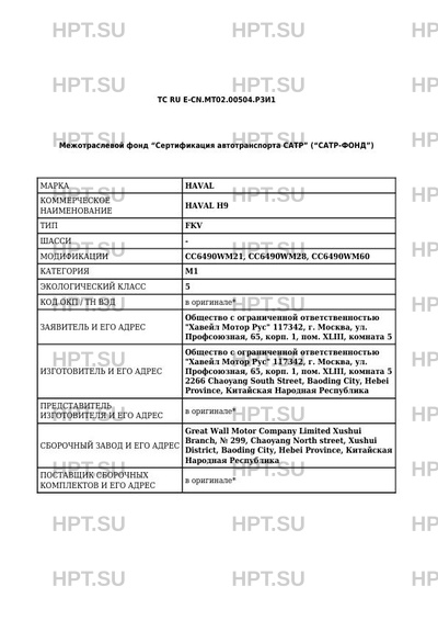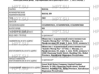 | Заявитель | Общество с ограниченной ответственностью "Хавейл Мотор Рус" 117342, г. Москва, ул. Профсоюзная, 65, корп. 1, пом. XLIII, комната 5 |