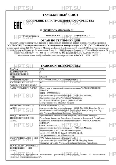 | Сборочный завод | FAW Jiefang Automotive Company, Ltd., юридический и фактический адрес: No.76, Dongfeng Street, Changchun City, Jilin Province, Китайская Народная Республика |