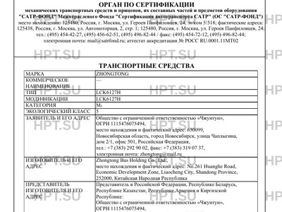 | Предприятие-изготовитель | Zhongtong Bus Holding Co., Ltd., место нахождения и фактический адрес: No.261 Huanghe Road, Economic Development Zone, Liaocheng City, Shandong Province, 252000, Китайская Народная Республика |