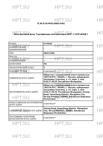 | Заявитель | Общество с ограниченной ответственностью "ЮТУН-РУС". 105005, г. Москва, набережная Академика Туполева, д. 15, корп. 2, пом. №56,57,58,59, Российская Федерация,. ОГРН: 1137746272762. Тел. +7 (495) 269-47-94. Факс --. Email yutongrussia@gmail.com. |