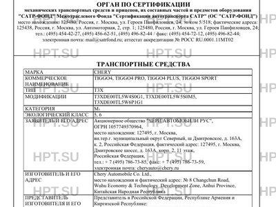 | Представитель изготовителя | Представитель в Российской Федерации, Республике Армения и Киргизской Республике: Акционерное общество "ЧЕРИ АВТОМОБИЛИ РУС", ОГРН 1057749370964, место нахождения: 127495, г. Москва, вн.тер.г. муниципальный округ Северный, ш Дмитровское, д. 163А, к. 2, Российская Федерация, фактический адрес: 127495, г. Москва, Дмитровское шоссе, д. 163А, корп. 2, 11 этаж, Российская Федерация, тел.: + 7 (495) 786-73-85, факс: + 7 (495) 786-73-59, электронная почта: cheryauto@chery.ru Представитель в Республике Беларусь: Общество с ограниченной ответственностью "Автоцентр на МКАД" УНП 193126788, место нахождения и фактический адрес: 220138, г. Минск, ул. Ваупшасова, 55, Автосалон, (2 этаж), Республика Беларусь, тел.: +375 17 250 40 00, факс: +375 17 250 40 00, электронная почта: ka@chinamobil.by Представитель в Республике Казахстан: Товарищество с ограниченной ответственностью "First Motor Group", БИН 210640019937, место нахождения и фактический адрес: 050060, г. Алматы, Бостандыкский район, Проспект Аль-Фараби, дом 107, Республика Казахстан, тел.: +7 701 722 96 17, факс: -, электронная почта: n.shamgonov@1motorgroup.kz |