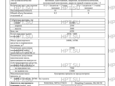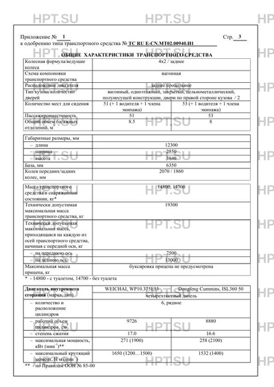 | Тип ТС | В случае превышения параметров, установленных приложением № 5 к техническому регламенту Таможенного союза "О безопасности колесных транспортных средств", для передвижения транспортных средств по территории государств - членов Таможенного союза необходимо оформление специального разрешения Мощность, измеренная без установленного на двигатель дополнительного оборудования (“брутто”), для двигателя WEICHAI, WP10.375E53 составляет 276 (1900) кВт (об/мин), для двигателя Dongfeng Cummins, ISL360 50 - 265 (2100) кВт (об/мин) Транспортные средства относятся к классу III и предназначены для перевозки исключительно сидящих пассажиров (абзац пятый пункта 2.2 приложения № 1 к техническому регламенту Таможенного союза "О безопасности колесных транспортных средств") |