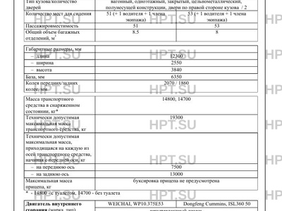 | Дополнительная информация | В случае превышения параметров, установленных приложением № 5 к техническому регламенту Таможенного союза «О безопасности колесных транспортных средств», для передвижения транспортных средств по территории государств — членов Таможенного союза необходимо оформление специального разрешения Мощность, измеренная без установленного на двигатель дополнительного оборудования (“брутто”), для двигателя WEICHAI, WP10.375E53 составляет 276 (1900) кВт (об/мин), для двигателя Dongfeng Cummins, ISL360 50 — 265 (2100) кВт (об/мин) Транспортные средства относятся к классу III и предназначены для перевозки исключительно сидящих пассажиров (абзац пятый пункта 2.2 приложения № 1 к техническому регламенту Таможенного союза «О безопасности колесных транспортных средств») |