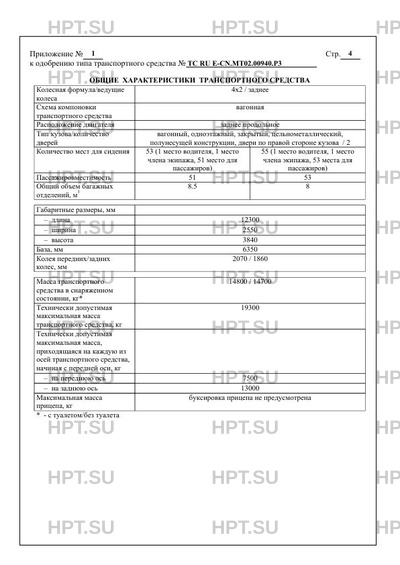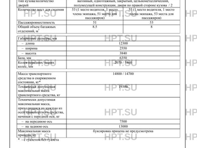 | Оборудование ТС | туалет (для варианта с количеством мест для сидения пассажиров - 51), электронная система контроля устойчивости (ESC), устройство вызова экстренных оперативных служб, устройство ограничения максимальной скорости, спутниковая система навигации ГЛОНАСС, тахограф, дневные ходовые огни по заказу: холодильник/охладитель питьевой воды (для варианта с количеством мест сидения пассажиров - 51); спальное место водителя; система наклона кузова (система книлинга); кондиционер (хладагент R134a); аудио-видео подготовка; телевизор; аудио-видео оборудование; информационное табло |