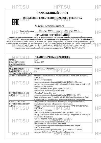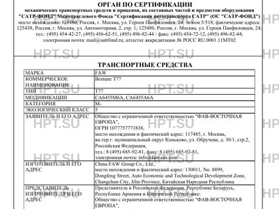 | Представитель изготовителя | Представитель в Российской Федерации, Республике Беларусь, Республике Армения и Киргизской Республике: Общество с ограниченной ответственностью "ФАВ-ВОСТОЧНАЯ ЕВРОПА", ОГРН 1077757771838, место нахождения и фактический адрес: 117485, г. Москва, вн.тер.г. муниципальный округ Коньково, ул. Обручева, д. 30/1, стр.2, Российская Федерация, тел.: 8 (495) 685-92-81, факс: 8 (495) 685-92-81, электронная почта: info@faw-rus.com Представитель в Республике Казахстан: Товарищество с ограниченной ответственностью "Вираж", БИН 981040003188, место нахождения и фактический адрес: 050016, г. Алматы, проспект Райымбека, 173, Республика Казахстан тел.: +7-727-356-48-37, факс: +7-727-356-48-37, электронная почта: info@virazh.kz |