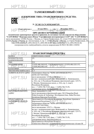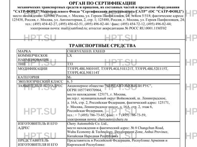 | Заявитель | Акционерное общество "ЧЕРИ АВТОМОБИЛИ РУС", ОГРН 1057749370964, место нахождения: 125171, г. Москва, вн.тер.г. муниципальный округ Войковский, ш. Ленинградское, д. 16А, стр. 2, Российская Федерация, фактический адрес: 125171, г. Москва, Ленинградское шоссе, д. 16А, стр. 2, этаж 6, Российская Федерация, тел.: + 7 (495) 786-73-85, факс: + 7 (495) 786-73-59, электронная почта: cheryauto@chery.ru |