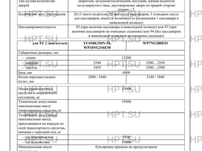 | Пассажировместимость | 85 (при наличии пассажира в инвалидной коляске) или 87 (при наличии пассажиров на откидных сиденьях) или 94 (без пассажиров в инвалидной коляске и на откидных сиденьях) для ТС с двигателем YC6MK320N-50, WP10NG336E50 WP7NG280E51 |