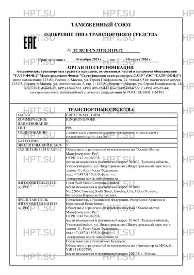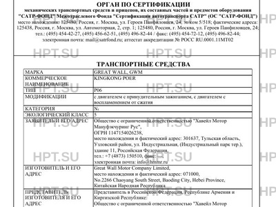 | Сборочный завод | Great Wall Motor Company Limited Jingmen Branch, место нахождения и фактический адрес: No.9, Zhixin Avenue, Duodao District, Jingmen City, Hubei Province, Китайская Народная Республика |