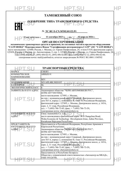 | Представитель изготовителя | Представитель в Российской Федерации, Республике Армения и Киргизской Республике: Акционерное общество "ЧЕРИ АВТОМОБИЛИ РУС", ОГРН 1057749370964, место нахождения: 127495, г. Москва, вн.тер.г. муниципальный округ Cеверный, Дмитровское шоссе, дом 163 А, корпус 2, помещение II, этаж 11, Российская Федерация, фактический адрес: 127495, г. Москва, Дмитровское шоссе, д. 163А, корп. 2, 11 этаж, Российская Федерация, тел.: + 7 (495) 786-73-85, факс: + 7 (495) 786-73-59, электронная почта: cheryauto@chery.ru Представитель в Республике Беларусь: Общество с ограниченной ответственностью "Автоцентр на МКАД", УНП 193126788 место нахождения и фактический адрес: 220138, г. Минск, ул. Ваупшасова, 55, Автосалон, (2 этаж), Республика Беларусь, тел.: +375 17 250 40 00, факс: +375 17 250 40 00, электронная почта: ka@chinamobil.by Представитель в Республике Казахстан: Товарищество с ограниченной ответственностью "First Motor Group", БИН 210640019937, место нахождения и фактический адрес: 050060, г. Алматы, Бостандыкский район, Проспект Аль-Фараби, дом 107, Республика Казахстан, тел.: +7 701 722 96 17, факс: -, электронная почта: n.shamgonov@1motorgroup.kz |