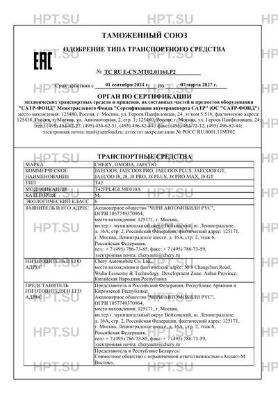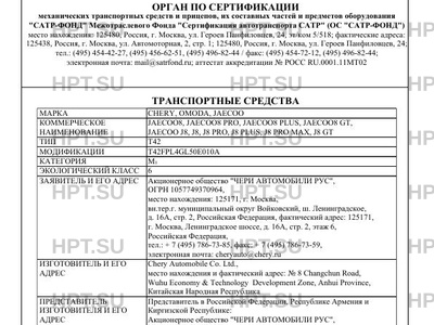 | Заявитель | Акционерное общество "ЧЕРИ АВТОМОБИЛИ РУС", ОГРН 1057749370964, место нахождения: 125171, г. Москва, вн.тер.г. муниципальный округ Войковский, ш. Ленинградское, д. 16А, стр. 2, Российская Федерация, фактический адрес: 125171, г. Москва, Ленинградское шоссе, д. 16А, стр. 2, этаж 6, Российская Федерация, тел.: + 7 (495) 786-73-85, факс: + 7 (495) 786-73-59, электронная почта: cheryauto@chery.ru |