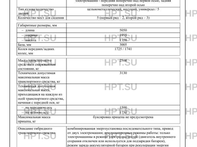| Описание гибридного ТС | комбинированная энергоустановка последовательного типа, привод от двух электромашин; предусмотренные режимы работы: только электромашины в режиме электродвигателей (двигатель внутреннего сгорания отключен или используется для подзарядки батареи), режим заряда аккумуляторной батареи при рекуперации энергии торможения; предусмотрена подзарядка тяговой аккумуляторной батареи от внешнего источника |