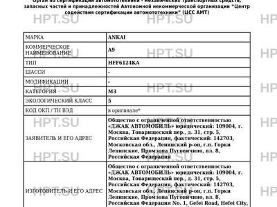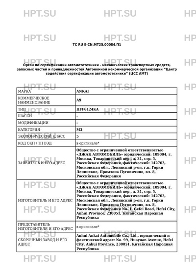 Предприятие-изготовитель Общество с ограниченной ответственностью "ДЖАК АВТОМОБИЛЬ" юридический: 109004, г. Москва, Товарищеский пер., д. 31, стр. 5, Российская Федерация, фактический: 142703, Московская обл., Ленинский р-он, г.п. Горки Ленинские, Промзона Пуговичино, вл. 8, Российская Федерация No. 1, Gefei Road, Hefei City, Anhui Province, 230051, Китайская Народная Республика