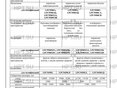 Оборудование ТС съемные стойки для перевозки длинномерных грузов (для мод. LPC9500A); откидной трап (для мод. LPC9500C, LPC9500CA, LPC9500CB); ящик для инструментов, два запасных колеса, противооткатные упоры (для всех модификаций); приспособления для фиксации груза (для мод. LPC9500A, LPC9500AK, LPC9500CA, LPC9500CB); контейнерные замки (для мод. LPC9500A, LPC9500AK, LPC9500CB); передняя лестница (для мод. LPC9500XXA, LPC9500XXB, LPC9500XXC, LPC9500XXD, LPC9500XPA, LPC9500XPB); лебедка (для мод. LPC9500CA, LPC9500CB)