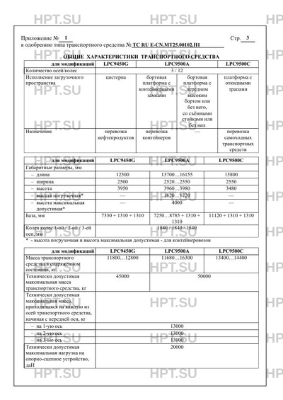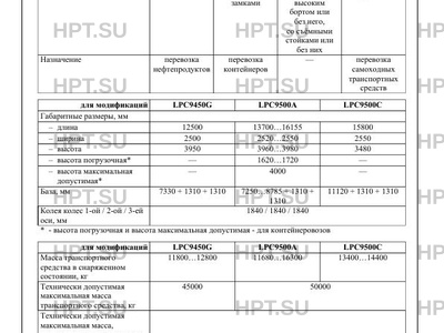 | Оборудование ТС | съемные стойки для перевозки длинномерных грузов, приспособления для фиксации груза, контейнерные замки (для мод. LPC9500A); откидной трап (для мод. LPC9500C); ящик для инструментов, два запасных колеса, противооткатные упоры (для всех модификаций) |