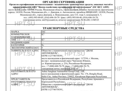 | Орган по сертификации | Орган по сертификации автомототехники - механических транспортных средств, запасных частей и принадлежностей "Центр содействия сертификации автомототехники" (АНО "ЦСС АМТ") |