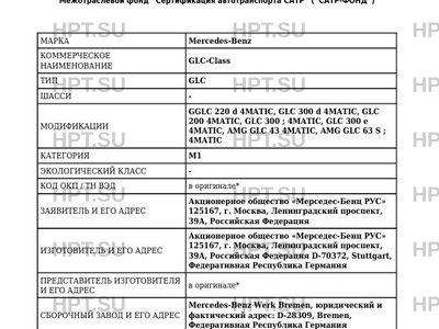 | Предприятие-изготовитель | Mercedes-Benz AG, юридический и фактический адрес: D-70372, Stuttgart, Федеративная Республика Германия Представитель в Российской Федерации: Акционерное общество "Мерседес-Бенц РУС", ОГРН 1027700258530, юридический и фактический адрес: 125167, гор. Москва, Ленинградский проспект, дом 39А, Российская Федерация, тел.: + 7 (495) 745-26-00, факс: +7 (495) 258-41-52, электронная почта: mbr@daimler.com |