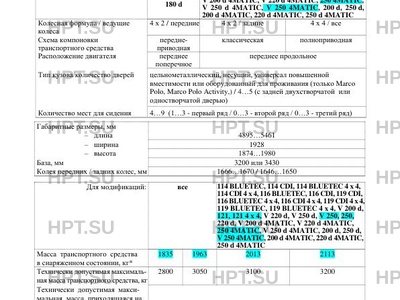 | Оборудование ТС | иммобилайзер, электронная система поддержания курсовой устойчивости (ESP), кондиционер или климат - контроль. по заказу: система помощи при парковке (PTS), активная система помощи при парковании, система помощи при трогании на уклоне, командная панель, круиз-контроль, система активного круизконтроля Distronic Plus, система контроля движения на уклоне, система "старт-стоп", камера заднего вида, система предупреждения о столкновении Collision Prevention Assist, система контроля "мертвых" зон, система превентивной безопасности Pre-Safe, система контроля за полосой движения, камеры кругового обзора, система мониторинга давления воздуха в шинах; для мод. c коммерческим наименованием Mercedes-Benz Marco Polo, Mercedes-Benz Marco Polo Activity: спальные места, трансформируемые из сидений, кухонное оборудование, стол и сиденья, шкафы, холодильник |