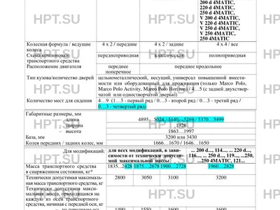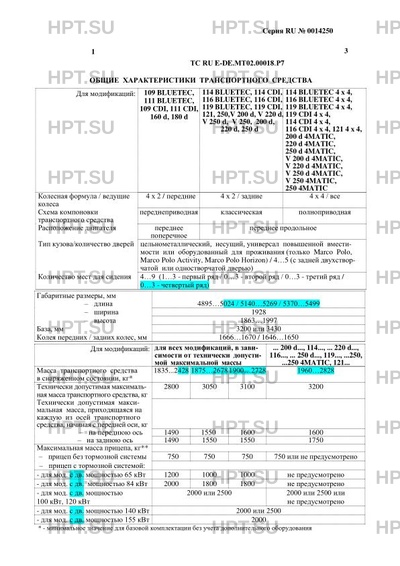 | Оборудование ТС | иммобилайзер, электронная система контроля устойчивости, устройство вызова экстренных оперативных служб, система мониторинга давления воздуха в шинах по заказу: совмещенная система вентиляции, отопления и кондиционирования (система управления климатом), система помощи при парковке на базе активного рулевого управления и датчиков расстояния, система активного круиз-контроля и/или система предупреждения о столкновении на базе радарного датчика, тягово-сцепное устройство для мод. c коммерческим наименованием Marco Polo, Marco Polo Activity, Marco Polo Ноrizon: спальные места, трансформируемые из сидений, стол; только для Marco Polo - кухонное оборудование, холодильник |