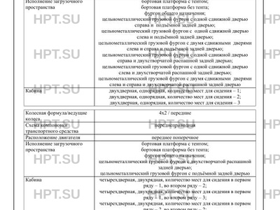| Исполнение загрузочного пространства | бортовая платформа с тентом; бортовая платформа без тента; фургон общего назначения; цельнометаллический грузовой фургон с одной сдвижной дверью справа и подъёмной задней дверью; цельнометаллический грузовой фургон с одной сдвижной дверью слева и подъёмной задней дверью; цельнометаллический грузовой фургон с двумя сдвижными дверями слева и справа и подъёмной задней дверью; цельнометаллический грузовой фургон с одной сдвижной дверью справа и двухстворчатой распашной задней дверью; цельнометаллический грузовой фургон с одной сдвижной дверью слева и двухстворчатой распашной задней дверью; цельнометаллический грузовой фургон с двумя сдвижными дверями слева и справа и двухстворчатой распашной задней дверью бортовая платформа с тентом; бортовая платформа без тента; фургон общего назначения; цельнометаллический грузовой фургон с двухстворчатой распашной задней дверью; цельнометаллический грузовой фургон с подъёмной задней дверью цельнометаллический грузовой фургон с двухстворчатой распашной задней дверью; цельнометаллический грузовой фургон с подъёмной задней дверью бортовая платформа с тентом; бортовая платформа без тента; фургон общего назначения; цельнометаллический грузовой фургон с двухстворчатой распашной задней дверью; цельнометаллический грузовой фургон с подъёмной задней дверью |