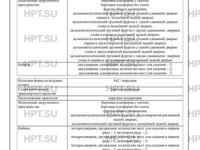 | Исполнение загрузочного пространства | бортовая платформа с тентом; бортовая платформа без тента; фургон общего назначения; цельнометаллический грузовой фургон с одной сдвижной дверью справа и подъёмной задней дверью; цельнометаллический грузовой фургон с одной сдвижной дверью слева и подъёмной задней дверью; цельнометаллический грузовой фургон с двумя сдвижными дверями слева и справа и подъёмной задней дверью; цельнометаллический грузовой фургон с одной сдвижной дверью справа и двухстворчатой распашной задней дверью; цельнометаллический грузовой фургон с одной сдвижной дверью слева и двухстворчатой распашной задней дверью; цельнометаллический грузовой фургон с двумя сдвижными дверями слева и справа и двухстворчатой распашной задней дверью бортовая платформа с тентом; бортовая платформа без тента; фургон общего назначения; цельнометаллический грузовой фургон с двухстворчатой распашной задней дверью; цельнометаллический грузовой фургон с подъёмной задней дверью цельнометаллический грузовой фургон с двухстворчатой распашной задней дверью; цельнометаллический грузовой фургон с подъёмной задней дверью бортовая платформа с тентом; бортовая платформа без тента; фургон общего назначения |