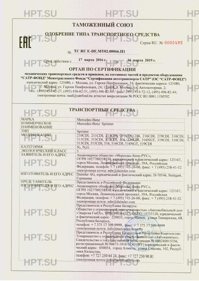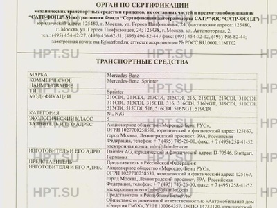 Коммерческое наименование Mercedes-Benz Sprinter / Sprinter / 210CDI, 211CDI, 213CDI, 215CDI, 216, 216CDI…
