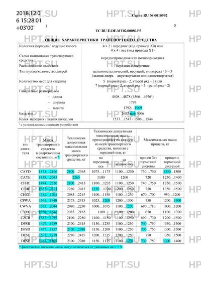 | Оборудование ТС | кондиционер, противобуксовочная система (ASR), электронная система обеспечения курсовой устойчивости (ESP), система крепления детского сиденья "ISOFIX", подушки безопасности, центральный замок, иммобилайзер, система вызова экстренных оперативных служб по заказу: климат-контроль, холодильник, автономный отопитель, акустическая система для парковки (APS), система помощи при парковке, подготовка под установку телефона, бортовой компьютер, стереосистема, CD-проигрыватель, навигационная система, CD-чейнджер, USB-порты, противоугонное устройство, подъемносдвижной люк в крыше с электрическим приводом, подъмный люк в задней части крыши, багажник на крыше, многосекционные сумки, складные стулья, рештчатая или пластиковая перегородка багажного отсека, противомоскитная сетка, тент, приставная палатка, раскладное спальное место, алюминиевый багажный короб, сигнализация, обогрев сидений, датчик дождя, датчик освещенности, омыватели фар, круиз-контроль, адаптивный круизконтроль, клетка для собак, выдвижной пол, система мониторинга давления воздуха в шинах, антенны наружные радио, систем спутниковой навигации, знак аварийной остановки, рейлинги, противотуманные фары, перегородки для защиты пассажиров при смещении багажа, сцепное устройство |