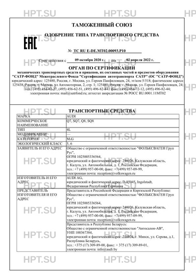 Оборудование ТС совмещенная система вентиляции, отопления и кондиционирования (система управления климатом) с автоматическим управлением, электронная система контроля устойчивости (ESP), противобуксовочная система (ASR), акустическая система парковки (APS), система автоматического поддержания дистанции (“Адаптивный круиз-контроль”) (ACC), система крепления детского сидения "ISOFIX", датчик дождя, подушки безопасности, устройство вызова экстренных оперативных служб по заказу: холодильник, подъемно-сдвижной люк в крыше, универсальная модульная система Multimedia Interface (MMI): бортовой компьютер, ТВтюнер аналоговый и цифровой, СD-чейнджер, DVD-чейнджер, стереомагнитола, CD-проигрыватель, навигационная система, 2 монитора, встроенные в подголовники передних сидений, "Audi music"- интерфейс для подключения iPod-аудиосистем и USB-аудиосистем, комплект оборудования для мобильной связи, навигационная система, система дистанционного управления воротами гаража (HomeLink), устройство для размещения и крепления багажа (телескопическая штанга и ремни), система для крепления багажа на крыше и багажный контейнер, багажник для перевозки велосипедов, съемный чехол для лыж и сноубордов, система помощи при смене ряда движения (Side assist), ассистент сохранения полосы движения, адаптивная пневматическая подвеска с регулировкой амортизаторов (5 уровней), откидывающиеся столики в спинках передних сидений, система мониторинга давления воздуха в шинах, сцепное устройство, наружные антенны (радио, телевизионные, систем спутниковой навигации), боковые подножки