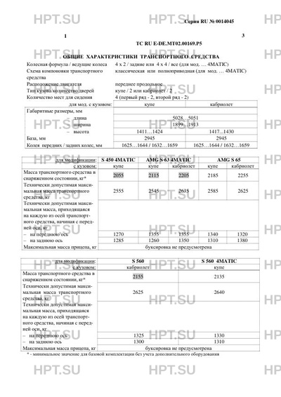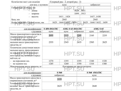 | Дополнительная информация | Транспортные средства соответствуют европейским экологическим нормам Euro-6. Допускаются меньшие по сравнению с приведенными в Приложении № 1 значения технически допустимой максимальной массы транспортного средства и технически допустимой максимальной массы, приходящейся на каждую из осей. Маркировка модификаций: МОДИФИКАЦИИ VIN: с кузовом: купе кабриолет S 450 4MATIC WDD217364… – S 560 4MATIC WDD217386… – S 560 – WDD217483… AMG S 63 4MATIC WDD217388… WDD217488… AMG S 65 WDD217379… WDD217479… |