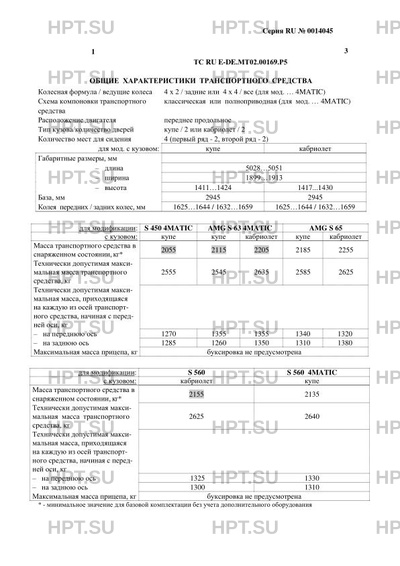 | Тип ТС | Транспортные средства соответствуют европейским экологическим нормам Euro-6. Допускаются меньшие по сравнению с приведенными в Приложении № 1 значения технически допустимой максимальной массы транспортного средства и технически допустимой максимальной массы, приходящейся на каждую из осей. Маркировка модификаций: МОДИФИКАЦИИ VIN: с кузовом: купе кабриолет S 450 4MATIC WDD217364... – S 560 4MATIC WDD217386... – S 560 – WDD217483... AMG S 63 4MATIC WDD217388… WDD217488… AMG S 65 WDD217379… WDD217479... |