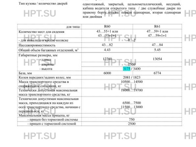 | Дополнительная информация | В зависимости от пассажировместимости транспортные средства относятся к классу II, предназначены для перевозки преимущественно сидящих пассажиров и имеют возможность для перевозки стоящих пассажиров в проходе или на площади, не превышающей площадь двойного пассажирского сидения или к классу III и предназначены для перевозки исключительно сидящих пассажиров (абзац пятый пункта 2.2 приложения № 1 к техническому регламенту Таможенного союза «О безопасности колесных транспортных средств»). В случае несоответствия параметров транспортных средств значениям, установленным в пунктах 2.1 и 2.2 приложения № 5 к техническому регламенту Таможенного союза “О безопасности колесных транспортных средств”, для передвижения транспортных средств по территории государств — членов Таможенного союза необходимо оформление специального разрешения. |