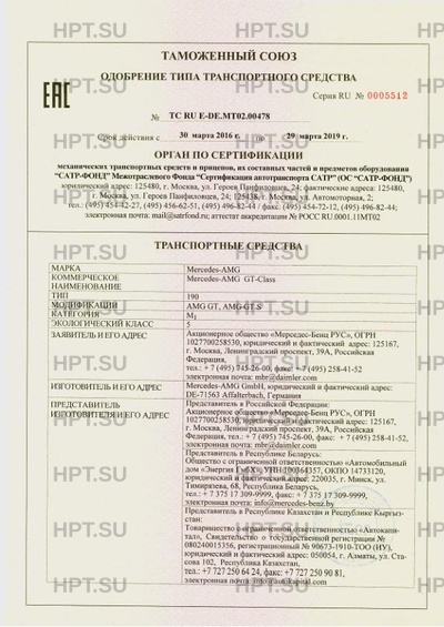 | Коммерческое наименование | Mercedes-AMG GT-Class / 190 / AMG GT, AMG GT S |