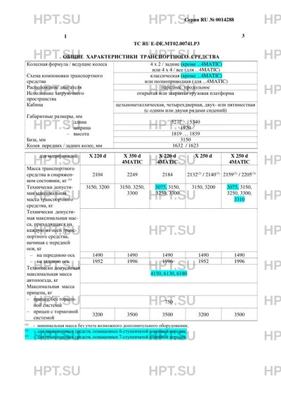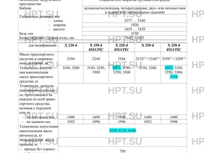 | Дополнительная информация | Допускаются меньшие по сравнению с приведенными в Приложении № 1 значения технически допустимой максимальной массы и технически допустимой максимальной массы, приходящейся на каждую из осей. Технически допустимая максимальная масса транспортного средства увеличивается на величину до 140 кг при эксплуатации с прицепом. До 01 ноября 2019 г. наименование изготовителя и его адрес – Daimler AG, D-70546, Stuttgart, Германия. Идентификация изготовителя транспортного средства после указанного срока производится по международному идентификационному коду изготовителя в идентификационном номере транспортного средства. Возможные сочетания модификаций и типов кузова: VIN: с колесной формулой Модификации: 4х2 4х4 Х 220 d W??4702101… – – W??4702111… Х 220 d 4MATIC – W??4702121… X 250 d W??4702301… – – W??4702311… X 250 d 4MATIC – W??4702321… X 350 d 4MATIC – W??4702521… |
