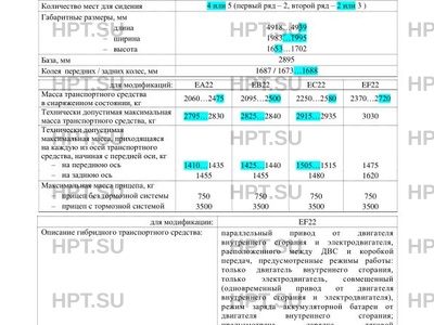 | Описание гибридного ТС | параллельный привод от двигателя внутреннего сгорания и электродвигателя, расположенного между ДВС и коробкой передач, предусмотренные режимы работы: только двигатель внутреннего сгорания, только электродвигатель, совмещенный (одновременный привод от двигателя внутреннего сгорания и электродвигателя), режим заряда аккумуляторной батареи от двигателя внутреннего сгорания; предусмотрена зарядка тяговой аккумуляторной батареи от внешнего источника |