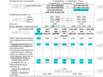 | Дополнительная информация | Транспортные средства соответствуют европейским экологическим нормам Euro-6. Допускаются меньшие по сравнению с приведенными в Приложении № 1 значения технически допустимой максимальной массы транспортного средства и технически допустимой максимальной массы, приходящейся на каждую из осей. До 01 ноября 2019 г. наименование изготовителя и его адрес – Daimler AG, D-70546, Stuttgart, Германия. Идентификация изготовителя транспортного средства после указанного срока производится по международному идентификационному коду изготовителя в идентификационном номере транспортного средства. Технически допустимая максимальная масса транспортного средства увеличивается на величину до 100 кг при эксплуатации с прицепом. Варианты маркировки модификаций: VIN: модификации: GLE-Class GLS-Class AMG GLE 53 4MATIC W??1671611… – GLE 300 d 4MATIC W??1671191… – GLE 450 4MATIC W??1671591… – GLE 400 d 4MATIC W??1671231… – GLS 450 4MATIC – W??1679591… GLS 580 4MATIC – W??1679861… GLS 400 d 4MATIC – W??1679231… |