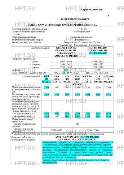| Тип ТС | Транспортные средства соответствуют европейским экологическим нормам Euro-6. Допускаются меньшие по сравнению с приведенными в Приложении № 1 значения технически допустимой максимальной массы транспортного средства и технически допустимой максимальной массы, приходящейся на каждую из осей. До 01 ноября 2019 г. наименование изготовителя и его адрес – Daimler AG, D-70546, Stuttgart, Германия. Идентификация изготовителя транспортного средства после указанного срока производится по международному идентификационному коду изготовителя в идентификационном номере транспортного средства. Технически допустимая максимальная масса транспортного средства увеличивается на величину до 100 кг при эксплуатации с прицепом. Варианты маркировки модификаций: VIN: модификации: GLE-Class GLS-Class AMG GLE 53 4MATIC W??1671611… – GLE 300 d 4MATIC W??1671191... – GLE 450 4MATIC W??1671591… – GLE 400 d 4MATIC W??1671231… – GLS 450 4MATIC – W??1679591… GLS 580 4MATIC – W??1679861... GLS 400 d 4MATIC – W??1679231… |