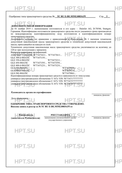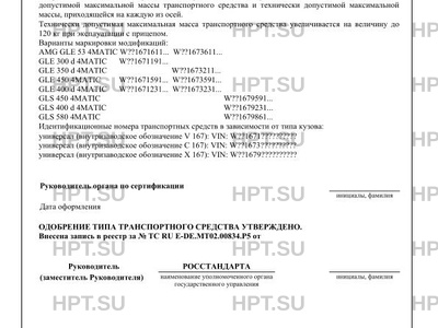 | Дополнительная информация | До 01 ноября 2019 г. наименование изготовителя и его адрес – Daimler AG, D-70546, Stuttgart, Германия. Идентификация изготовителя транспортного средства после указанного срока производится по международному идентификационному коду изготовителя в идентификационном номере транспортного средства. Допускаются меньшие по сравнению с приведенными в Приложении № 1 значения технически допустимой максимальной массы транспортного средства и технически допустимой максимальной массы, приходящейся на каждую из осей. Технически допустимая максимальная масса транспортного средства увеличивается на величину до 120 кг при эксплуатации с прицепом. Варианты маркировки модификаций: AMG GLE 53 4MATIC W??1671611… W??1673611… GLE 300 d 4MATIC W??1671191… GLE 350 d 4MATIC W??1673211… GLE 450 4MATIC W??1671591… W??1673591… GLE 400 d 4MATIC W??1671231… W??1673231… GLS 450 4MATIC W??1679591… GLS 400 d 4MATIC W??1679231… GLS 580 4MATIC W??1679861… Идентификационные номера транспортных средств в зависимости от типа кузова: универсал (внутризаводское обозначение V 167): VIN: W??1671?????????? универсал (внутризаводское обозначение С 167): VIN: W??1673?????????? универсал (внутризаводское обозначение X 167): VIN: W??1679?????????? |