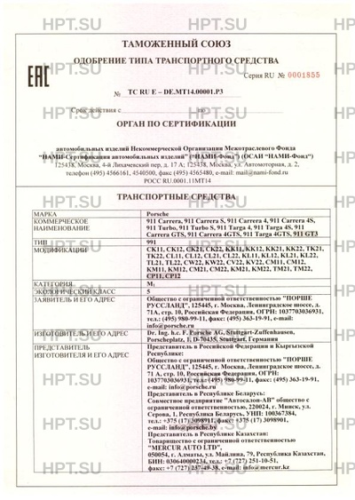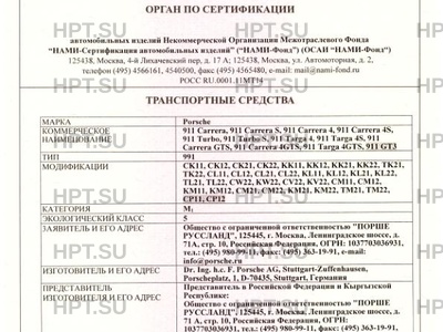 Представитель изготовителя Общество с ограниченной ответственностью "ПОРШЕ РУССЛАНД". 125445, г. Москва, Ленинградское шоссе, д. 71А, стр. 10, Российская Федерация. ОГРН: 1037703036931. Тел. (495) 980-99-11. Факс (495) 363-19-91. Представитель в Российской Федерации и Кыргызской Республике: Общество с ограниченной ответственностью "ПОРШЕ РУССЛАНД", 125445, г. Москва, Ленинградское шоссе, д. 71 А, стр. 10, Российская Федерация, ОГРН: 1037703036931, тел.: (495) 980-99-11, факс: (495) 363-19-91, e-mail: info@porsche.ru Представитель в Республике Беларусь: Совместное предприятие "Автосалон-АВ" общество с ограниченной ответственностью, 220024, г. Минск, ул. Серова, 1, Республика Беларусь, УНП: 100367384, тел.: +375 (17) 3098911, факс: +375 (17) 3098901, e-mail: info@porsche.by Представитель в Республике Казахстан: Товарищество с ограниченной ответственностью "MERCUR AUTO LTD", 050054, г. Алматы, ул. Майлина, 79, Республика Казахстан, БИН: 030640000234, тел.: +7 (727) 251-10-51, факс: +7 (727) 237-49-38, e-mail: info@mercur.kz