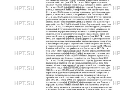 | Исполнение загрузочного пространства | открытая грузовая платформа, с каркасом и тентом или без них (для SPR 24… в мод. DА01 кроме перевозки опасных грузов); открытая грузовая платформа, с каркасом и тентом (для SPR 24… в мод. DА01 для перевозки опасных грузов); бортовая платформа, с каркасом и тентом или без них (для SPR 24… в мод. DА02 кроме перевозки опасных грузов); бортовая платформа, с каркасом и тентом (для SPR 24… в мод. DА02 для перевозки опасных грузов); бортовая платформа, с каркасом и тентом, с гидробортом или без него (для SPR 24… в мод. DА06 кроме перевозки опасных грузов); бортовая платформа, с каркасом и тентом, с гидробортом или без него (для SPR 24… в мод. DА06 для перевозки опасных грузов); фургон с задними распашными дверями, или со складывающейся дверью типа рольставни, и/или с одностворчатой дверью с правой или с левой стороны или без нее, без теплоизоляции, с гидробортом или без него (для SKO 24… в мод. DА03 кроме перевозки опасных грузов); специализированный фургон из жаропрочных и огнестойких материалов, со сплошными внутренними поверхностями с задними распашными дверями, и/или с одностворчатой дверью с правой или с левой стороны или без нее, с гидробортом или без него (для SKO 24… в мод. DА03 для перевозки опасных грузов); фургон с задними распашными дверями, или со складывающейся дверью типа рольставни, и/или с одностворчатой дверью с правой или с левой стороны или без нее, с теплоизоляцией, с холодильной установкой (хладагент R-134a или R-404a или R-452а), с гидробортом или без него (для SKO 24… в мод. DА04 кроме перевозки опасных грузов); специализированный фургон из жаропрочных и огнестойких материалов, с задними распашными дверями, и/или с одностворчатой дверью с правой или с левой стороны или без нее, с гидробортом или без него (для SKO 24… в мод. DА04 для перевозки опасных грузов); фургон с задними распашными дверями, или со складывающейся дверью типа рольставни, и/или с одностворчатой дверью с правой или с левой стороны или без нее, с теплоизоляцией, с гидробортом или без него (для SKO 24… в мод. DА05 кроме перевозки опасных грузов); специализированный фургон из жаропрочных и огнестойких материалов, с задними распашными дверями, и/или с одностворчатой дверью с правой или с левой стороны или без нее, с гидробортом или без него (для SKO 24… в мод. DА05 для перевозки опасных грузов); грузовая платформа с каркасом и тентом, с задними воротами или без них, с передним высоким бортом или без него, или платформа с бортами или без них, с каркасом и сдвижным тентом, с задними воротами или с откидным бортом, с передним высоким бортом или без него, с гидробортом или без него (SCS 24… в мод. DА06 кроме перевозки опасных грузов); грузовая платформа с каркасом и тентом, с задними воротами или без них, с передним высоким бортом или без него, или платформа с бортами или без них, с каркасом и тентом, с задними воротами или с откидным бортом, с передним высоким бортом или без него, с гидробортом или без него (SCS 24… в мод. DА06 для перевозки опасных грузов); фургон с задними распашными дверями, или со складывающейся дверью типа рольставни, и/или с одностворчатой дверью с правой или с левой стороны или без нее, без теплоизоляции, с гидробортом или без него (для SBO 24…); самосвальный кузов с разгрузкой назад (для SKI 24…). 4 |