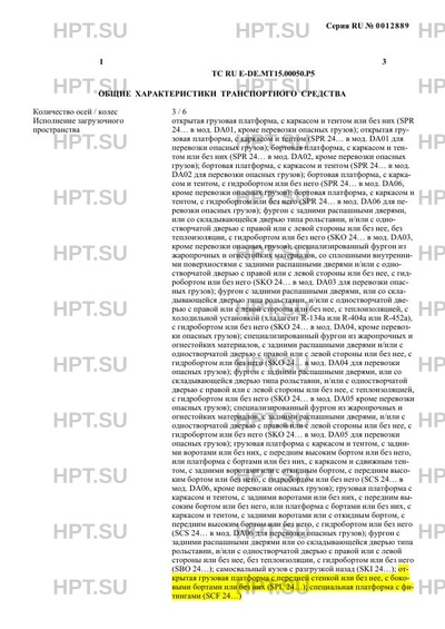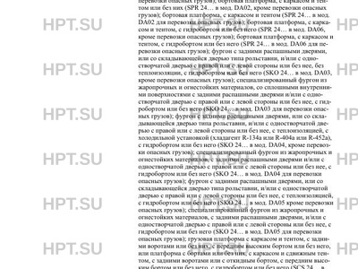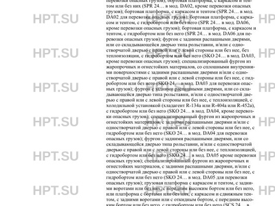Исполнение загрузочного пространства открытая грузовая платформа, с каркасом и тентом или без них (SPR 24… в мод. DА01, кроме перевозки опасных грузов); открытая грузовая платформа, с каркасом и тентом (SPR 24… в мод. DА01 для перевозки опасных грузов); бортовая платформа, с каркасом и тентом или без них (SPR 24… в мод. DА02, кроме перевозки опасных грузов); бортовая платформа, с каркасом и тентом (SPR 24… в мод. DА02 для перевозки опасных грузов); бортовая платформа, с каркасом и тентом, с гидробортом или без него (SPR 24… в мод. DА06, кроме перевозки опасных грузов); бортовая платформа, с каркасом и тентом, с гидробортом или без него (SPR 24… в мод. DА06 для перевозки опасных грузов); фургон с задними распашными дверями, или со складывающейся дверью типа рольставни, и/или с одностворчатой дверью с правой или с левой стороны или без нее, без теплоизоляции, с гидробортом или без него (SKO 24… в мод. DА03, кроме перевозки опасных грузов); специализированный фургон из жаропрочных и огнестойких материалов, со сплошными внутренними поверхностями с задними распашными дверями и/или с одностворчатой дверью с правой или с левой стороны или без нее, с гидробортом или без него (SKO 24… в мод. DА03 для перевозки опасных грузов); фургон с задними распашными дверями, или со складывающейся дверью типа рольставни, и/или с одностворчатой дверью с правой или с левой стороны или без нее, с теплоизоляцией, с холодильной установкой (хладагент R-134a или R-404a или R-452а), с гидробортом или без него (SKO 24… в мод. DА04, кроме перевозки опасных грузов); специализированный фургон из жаропрочных и огнестойких материалов, с задними распашными дверями и/или с одностворчатой дверью с правой или с левой стороны или без нее, с гидробортом или без него (SKO 24… в мод. DА04 для перевозки опасных грузов); фургон с задними распашными дверями, или со складывающейся дверью типа рольставни, и/или с одностворчатой дверью с правой или с левой стороны или без нее, с теплоизоляцией, с гидробортом или без него (SKO 24… в мод. DА05 кроме перевозки опасных грузов); специализированный фургон из жаропрочных и огнестойких материалов, с задними распашными дверями, и/или с одностворчатой дверью с правой или с левой стороны или без нее, с гидробортом или без него (SKO 24… в мод. DА05 для перевозки опасных грузов); грузовая платформа с каркасом и тентом, с задними воротами или без них, с передним высоким бортом или без него, или платформа с бортами или без них, с каркасом и сдвижным тентом, с задними воротами или с откидным бортом, с передним высоким бортом или без него, с гидробортом или без него (SCS 24… в мод. DА06, кроме перевозки опасных грузов); грузовая платформа с каркасом и тентом, с задними воротами или без них, с передним высоким бортом или без него, или платформа с бортами или без них, с каркасом и тентом, с задними воротами или с откидным бортом, с передним высоким бортом или без него, с гидробортом или без него (SCS 24… в мод. DА06 для перевозки опасных грузов); фургон с задними распашными дверями или со складывающейся дверью типа рольставни, и/или с одностворчатой дверью с правой или с левой стороны или без нее, без теплоизоляции, с гидробортом или без него (SBO 24…); самосвальный кузов с разгрузкой назад (SKI 24…); открытая грузовая платформа c передней стенкой или без нее, с боковыми бортами или без них (SPL 24…); специальная платформа с фитингами (SCF 24…) 4