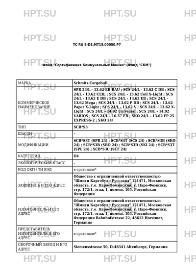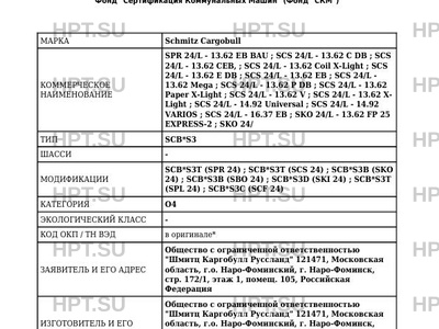 | Представитель изготовителя | Представитель в Российской Федерации и Республике Армения: Общество с ограниченной ответственностью "Шмитц Каргобулл Руссланд", ОГРН 1064703080243, место нахождения: 121471, Московская область, г.о. Наро-Фоминский, г. Наро-Фоминск, стр. 172/1, этаж 1, помещ. 105, Российская Федерация, фактический адрес: 121471, Московская область, г.о. Наро-Фоминский, г. Наро-Фоминск, стр. 172/1, этаж 1, помещ. 105, Российская Федерация, тел.: +7 495 741-32-32, факс: +7 495 741-32-33, электронная почта: info@cargobull.ru Представитель в Республике Беларусь: Иностранное общество с ограниченной ответственностью "Шмитц Каргобулл Бел", УНП 191120055, место нахождения и фактический адрес: 222860, Минская область, Пуховичский район, д. 2 (трасса М-5, 26-й - 26 км), Республика Беларусь, тел.: + 375 44 511-31-52, факс: -, электронная почта: info@cargobull.by Представитель в Республике Казахстан: Товарищество с ограниченной ответственностью "Schmitz Cargobull KAZ", БИН 220940015580, место нахождения и фактический адрес: 040700, Алматинская область, Илийский район, Энергетический сельский округ, село Отеген батыр, Участок Промзона, здание 207, Республика Казахстан, тел.: +7 727 243 31 74, факс: -, электронная почта: info@cargobull.kz Представитель в Киргизской Республике: Общество с ограниченной ответственностью "Бишкек трак Сервис", ИНН 01210200910224, место нахождения и фактический адрес: 720048, город Бишкек, улица Виноградная, дом 1, Киргизская Республика, тел.: +7 (312)-63-10-48, факс: +7 (312)-44-94-98, электронная почта: bishkek.truck.service@mail.ru |