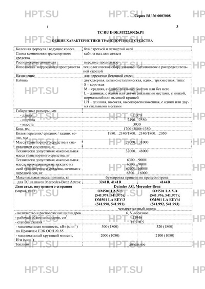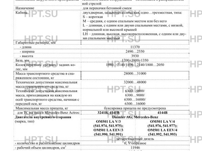| Дополнительная информация | Транспортное средство изготовлено на базе шасси транспортных средств марки Mercedes-Benz типа Actros модификаций 3241В, 4141В, 4144В. В случае превышения параметров, указанных в пунктах 2.1 и 2.2 Приложения № 5 к техническому регламенту Таможенного союза «О безопасности колесных транспортных средств», для передвижения транспортных средств по территории государств — членов Таможенного союза необходимо оформление специального разрешения. |
