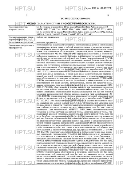 | Дополнительная информация | Транспортные средства не предназначены для перевозки опасных грузов и пищевых продуктов. Транспортные средства KATT/3 изготавливаются на базе шасси Mercedes-Benz Actros (модификации 3332, 3332K, 3336, 3336K, 3341, 3341K, 3346, 3346K, 3348B, 3351, 3351K, 3355, 3360, 3332A, 3332AK, 3336A, 3336AK, 3341A, 3341AK, 3346A, 3346AK, 3351A, 3351AK). Транспортные средства, изготавливаемые на базе шасси Mercedes-Benz Actros (модификации 3332, 3332K, 3336, 3336K, 3341, 3341K, 3346, 3346K, 3348B, 3351, 3351K, 3355, 3360) относятся к категории N3. Транспортные средства, изготавливаемые на базе шасси Mercedes-Benz Actros (модификации 3332A, 3332AK, 3336A, 3336AK, 3341A, 3341AK, 3346A, 3346AK, 3351A, 3351AK) относятся к категории N3G. В случае фактического превышения значений параметров, указанных в приложении № 5 к техническому регламенту Таможенного союза «О безопасности колесных транспортных средств» (ТР ТС 018/2011), для передвижения транспортных средств по территории государств-членов Таможенного союза необходимо оформление специального разрешения. Данное одобрение типа транспортного средства является распространением одобрения типа транспортного средства ТС RU E-DE.АБ93.00016. |