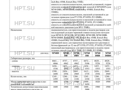 | Назначение | пневмонагнеталь для приготовления и подачи растворов для последующей укладки черновой стяжки полусухим методом (для M740 D, M740 DB, M740 DBS, M760 DH, M760 DHB, M760 DHBS, Estrich Boy 450, Estrich Boy 450B, Estrich Boy 450BS, Estrich Boy 550, Estrich Boy 550B, Estrich Boy 550BS); поршневой насос для перекачки мелкозернистого раствора и бетона фракцией до 32 мм (P715TD, P715TE, P718TD, P718TE); шнековый растворонасос для приготовления и подачи строительных смесей (для SP11 TMR, P13 DMR, P13 EMR) для мод.: M740D M740 DB M740 DBS M760 DH M760 DHB M760 DHBS |