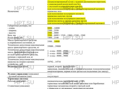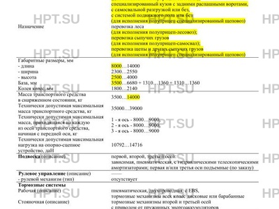 | Дополнительная информация | Транспортные средства не предназначены для перевозки опасных грузов. Транспортные средства изготавливаются в исполнениях: • полуприцеп-лесовоз; • полуприцеп-самосвал; • полуприцеп специализированный щеповоз. В случае фактического превышения значений параметров, указанных в приложении № 5 к техническому регламенту Таможенного союза «О безопасности колесных транспортных средств» (ТР ТС 018/2011), для передвижения транспортных средств по территории Евразийского экономического союза необходимо оформление специального разрешения. |