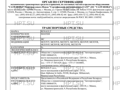 | Орган по сертификации | Орган по сертификации механических транспортных средств и прицепов, их составных частей и предметов оборудования "САTР-ФОНД" Межотраслевого Фонда "Сертификация автотранспорта САТР" (ОС "САТР-ФОНД") |