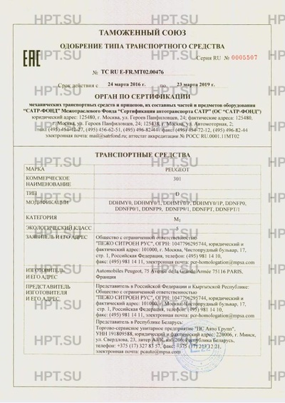 | Заявитель | Общество с ограниченной ответственностью "ПЕЖО СИТРОЕН РУС". 101000, г. Москва, Чистопрудный бульвар, 17, стр. 1, Российская Федерация. ОГРН: 1047796295744. Тел. (495) 981 14 10. Факс (495) 981 14 11. Email pcr-homologation@mpsa.com. |