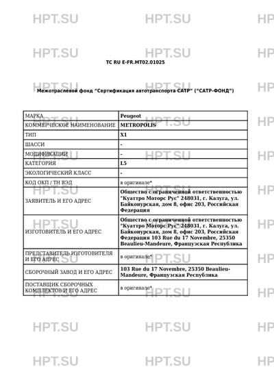 | Предприятие-изготовитель | PEUGEOT MOTOCYCLES,. 103 Rue du 17 Novembre, 25350 Beaulieu-Mandeure, Французская Республика. |