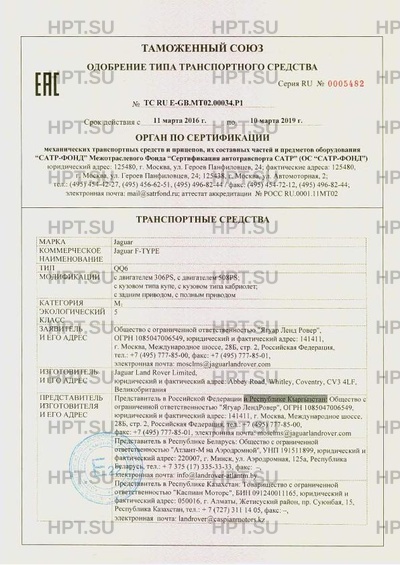 | Заявитель | Общество с ограниченной ответственностью «Ягуар Ленд Ровер» (ООО «Ягуар Ленд Ровер»). 141411, Москва, Международное шоссе, д. 28Б, стр. 2, Российская Федерация. ОГРН: 1085047006549. Тел. .(495) 777-85-00. Факс (495) 777-85-01. Email mosclms@jaguarlandrover.com. |